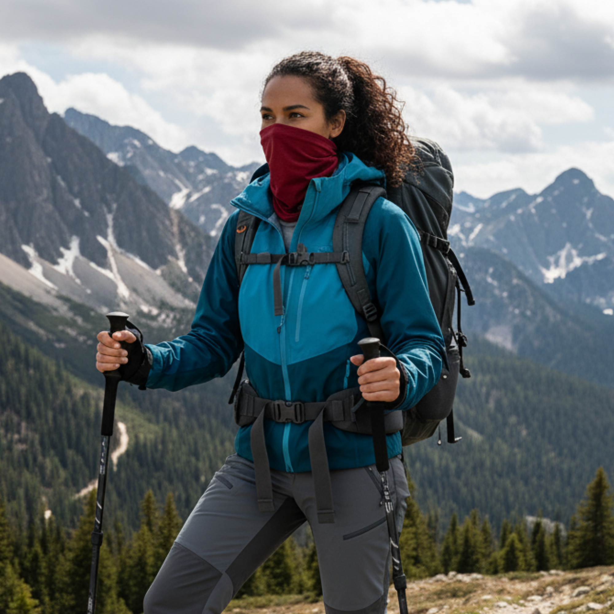 A blonde traveler with a large backpack standing in a busy train stationA camper in black base layers preparing a hot drink next to a tent with mountains behindA woman in a beanie and red top posing on a rocky ridge with a backpackTwo folded base-layer tops (cream and red) on a countertop beside a washing machine with laundry supplies