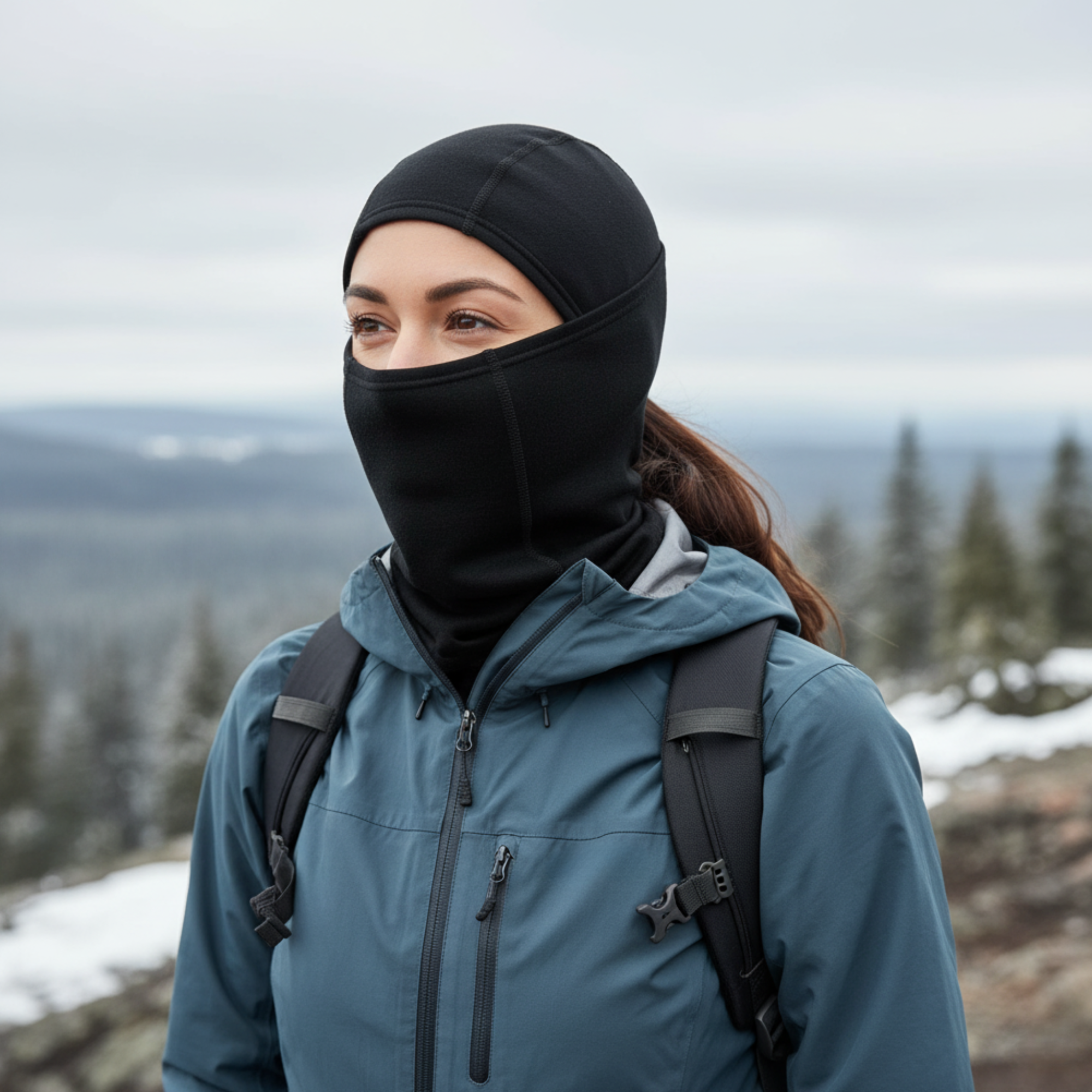 Woman wearing a black merino wool thermal base layer under a ski jacket in alpine conditions, emphasizing performance layering and cold-weather comfort.