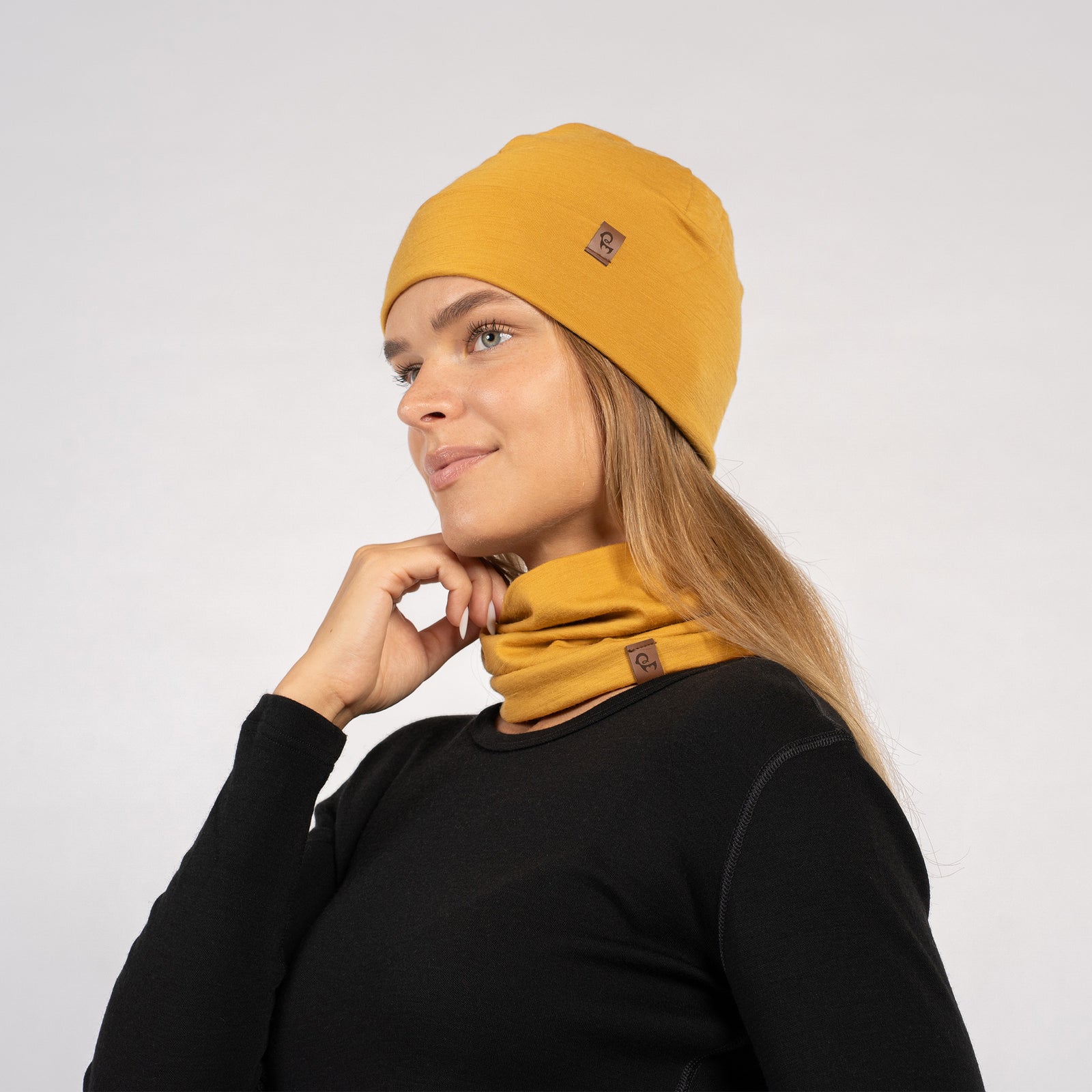 Woman in yellow Merino beanie and gaiter worn around neck, posing in black long sleeve top – side view.