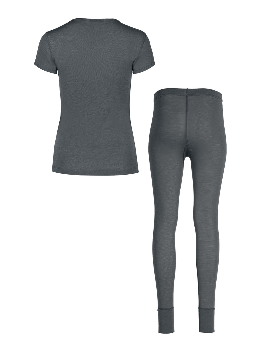 Crafted from a high-quality Merino wool, a naturally elastic set of matching short sleeve top and leggings provides stretch, comfort, and lightness. Organic fabric wicks away sweat and dries quickly; thus, the clothes are simple to maintain and care for.
